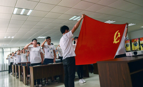 大会在雄壮的国歌声中拉开了序幕。27名新党员代表在面向党旗庄严宣誓。新党员郑孜宇、优秀共产党员张为娜分别作新老党员发言。