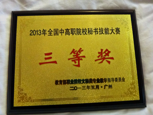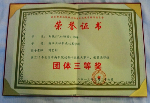 2013年5月25至26日,语言系文秘专业杜盼盼、刘俊江、郭洋3位同学在刘艺虹老师带领下代表我院首次参加全国秘书职业技能大赛,荣获团体三等,参赛的3位同学还分别获得了秘书职业基础知识、个人全能、工作技能3个单项三等奖。