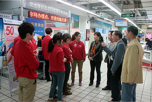 2012年4月13日下午,我院教务处王海慧副处长、校企合作处张敬伟处长、楼望老师、商务系李庆海主任以及两位实习指导老师,共同赴沃尔玛杭州黄龙店检查学生顶岗实习工作,看望同学们。在公司人力资源经理陪同下,逐一到实习学生所在的各个部门看望实习同学,了解实习情况。