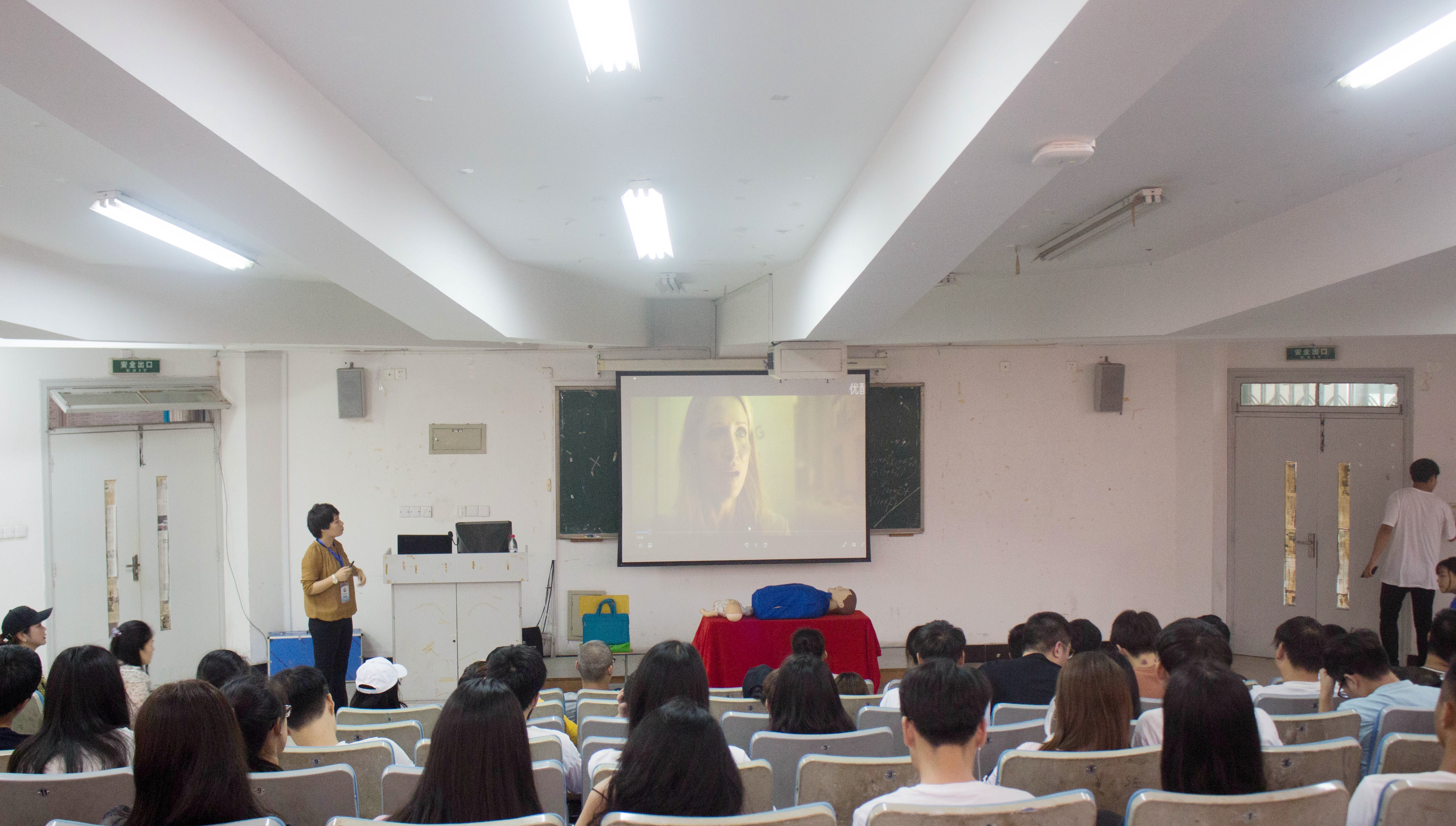 此次讲座我们邀请了杭州市急救中心首席金牌健康讲师钱里娜老师为我校学生作以急救知识为主要内容的专题讲座。钱里娜老师结合自己多年的工作实践经验,采用多媒体教学方式,利用视频、图片,深入浅出地向同学们讲解了遇到紧急情况时正确的现场维护和有效的判断救护,并利用人体模型向同学们示范如何对心脏骤停者进行紧急心脏复苏,详细讲解如何调整体位、判断呼吸、胸外心脏按压方法和频率、人工呼吸动作要领等相关知识。