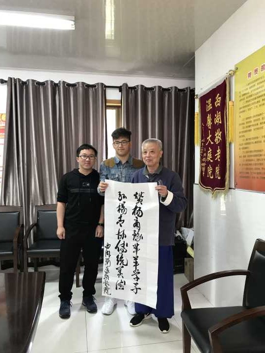 老人们看到我们非常开心,很乐意跟我们聊天,对于我们的到来也非常感动。午饭时分,我们把带去的水果分给他们,老人们脸上洋溢出喜悦的笑容。饭后,一位会书法的老人执意要亲手给我们商务系青协部写一幅字,上联为“赞扬商务莘莘学子”,下联为“弘扬青协传统美德”,令我们很受鼓舞。