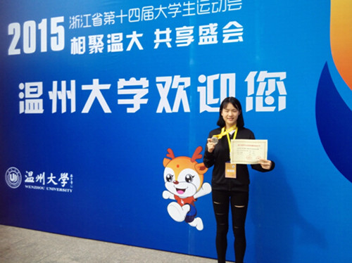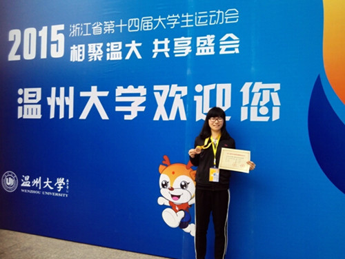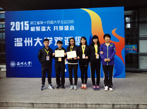 浙江长征职业技术学院代表团由杜宝山副院长任团长。在体育教研室曹桂霞、王海霞两位教练员的严格训练与认真指导下,从我院田径健儿中选拔出6位优秀运动员参加此次比赛。比赛期间一直下着雨,但我院运动员不畏风雨,顽强拼搏,赛出了风格,赛出了水平。经过5天激烈的竞争,获得了骄人的成绩:陈莉倩同学获得女子跳高第二名,以1.52米的成绩打破了省大运会女子跳高赛会记录;沈盼同学获得女子100米栏第三名和三级跳远第五名; 陈琪同学获得女子400米第六名; 倪秀婷同学获得女子400米第四名和800米第八名,同时,陈莉倩、徐扬两位同学还被大会评为“优秀运动员”。